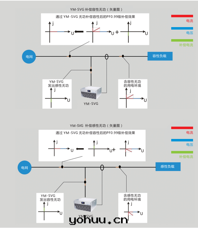YM静(jìng)止无功發(fà)生(shēng)器(SVG)通(tòng)过(guò)外(wài)部(bù)電(diàn)流互感(gǎn)器(CT),實(shí)时(shí)檢測负载(zài)電(diàn)流,並(bìng)通(tòng)过(guò)內(nèi)部(bù)DSP計(jì)算来(lái)分(fēn)析负载(zài)電(diàn)流的(de)无功含量(liàng),然後(hòu)根(gēn)據(jù)設置值来(lái)控制PWM信(xìn)号(hào)發(fà)生(shēng)器發(fà)出(chū)控制信(xìn)号(hào)給(gěi)內(nèi)部(bù)IGBT使逆变器産生(shēng)滿足要(yào)求的(de)无功補償電(diàn)流,實(shí)现動(dòng)态无功補償的(de)目的(de)。
